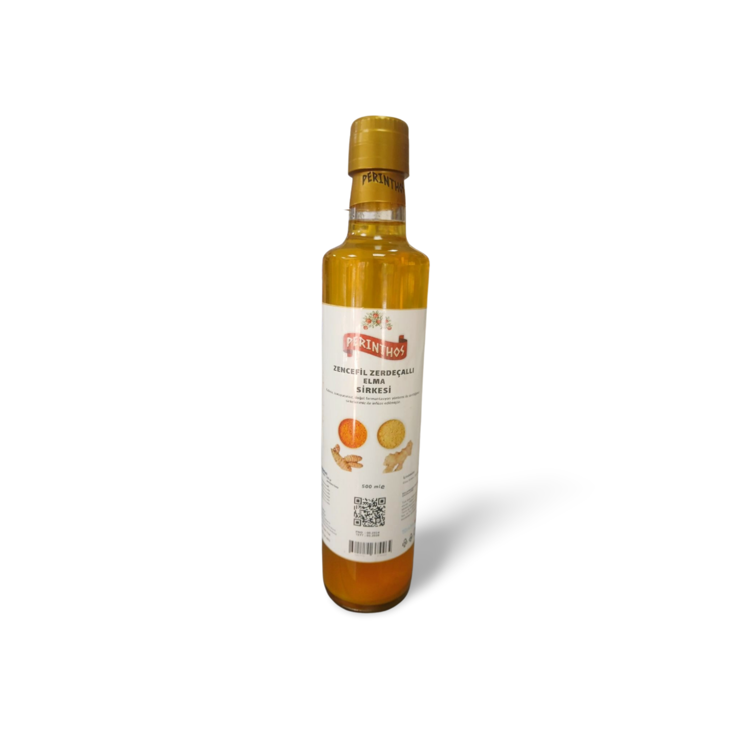 Perinthos Doğal Zencefil Zerdeçal Sirkesi, Kök Zencefil, Kök Zerdeçal ve Perinthos Doğal Elma Sİrkesinden üretilmiştir.